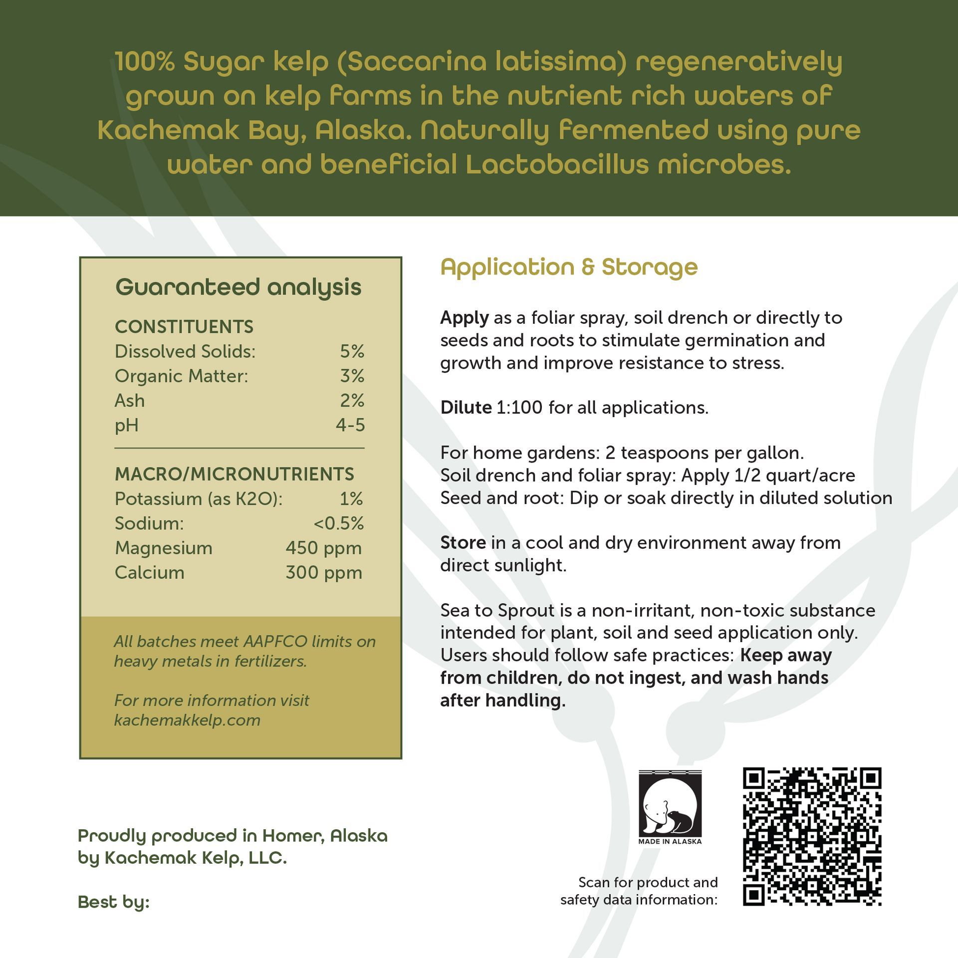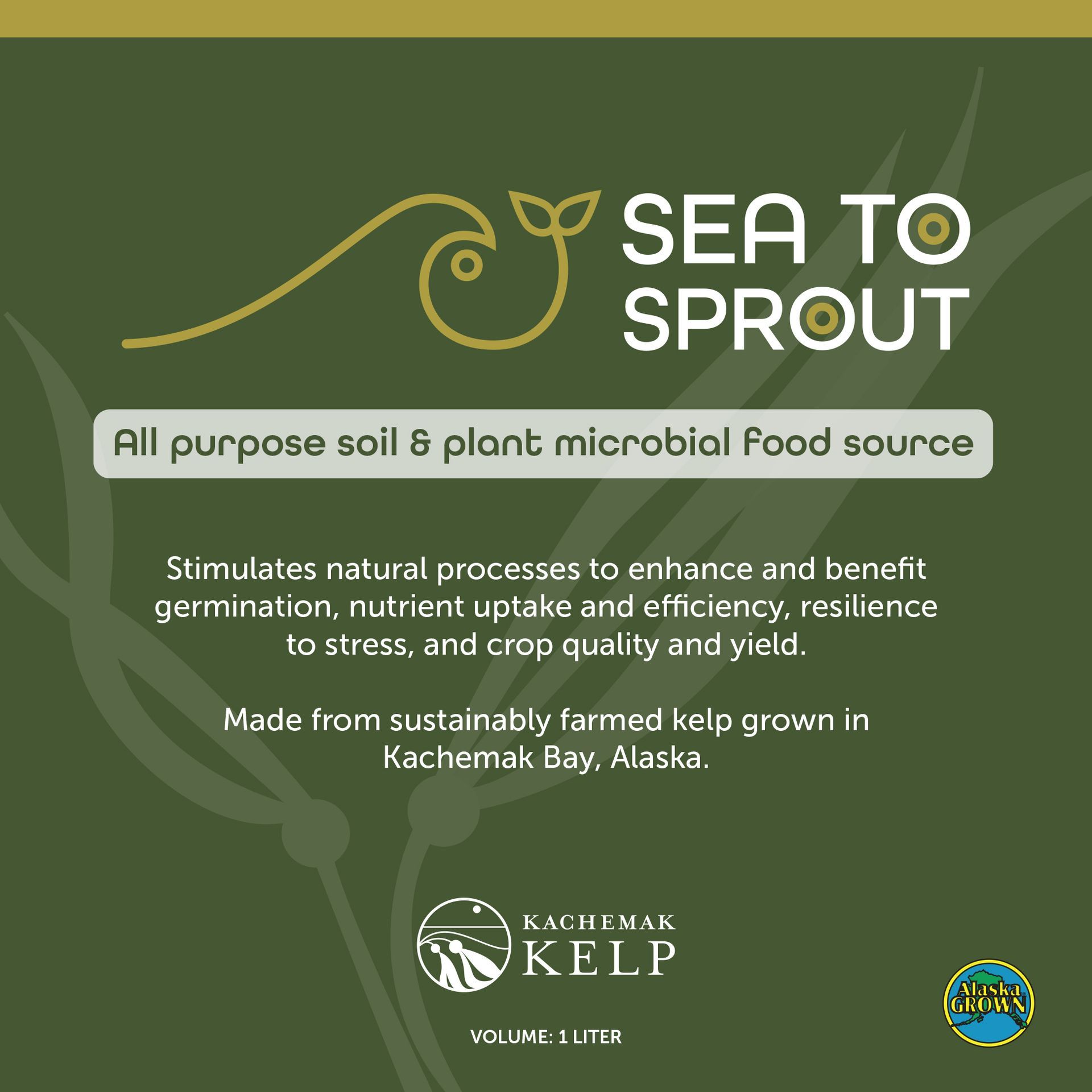 Introducing Sea to Sprout, an all-purpose microbial food for soil and plants. This kelp-based biostimulant supports the natural processes that help seeds germinate, improve nutrient use, strengthen resilience to stress, and promote healthy, high-quality growth. It's made from sugar kelp regeneratively farmed in Kachemak Bay and lower Cook Inlet, making it the perfect supplement for Alaskan home gardens, indoor plants, or on the farm.